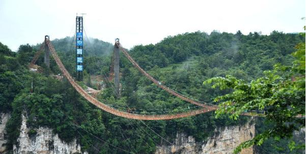 貓道架設(shè)完工的張家界大峽谷玻璃橋(7月15日攝)