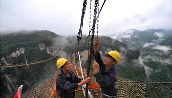 7月15日,施工人員在張家界大峽谷玻璃橋貓道上檢查鋼索。