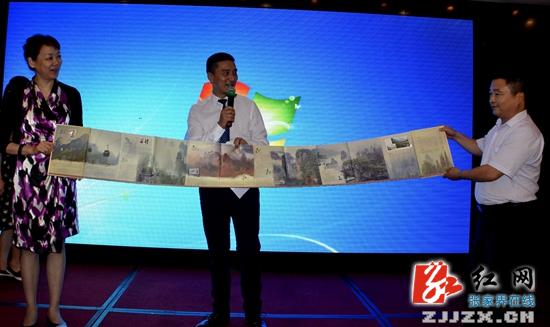武陵源區(qū)人民政府副區(qū)長萬齊坤向上海靜安區(qū)旅游局贈(zèng)送張家界風(fēng)光紀(jì)念冊(圖片來源紅網(wǎng))
