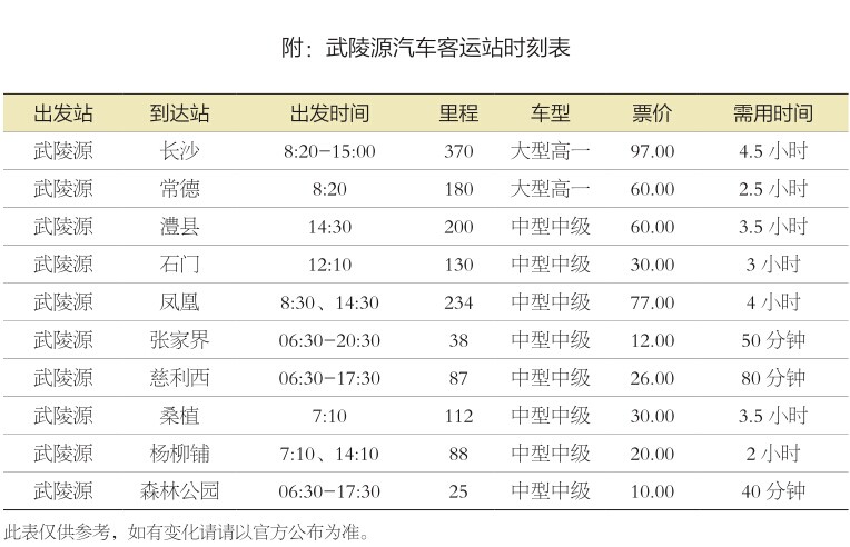 附:武陵源汽車(chē)客運(yùn)站時(shí)刻表(具體班次、線路和票價(jià)可能會(huì)變動(dòng)或調(diào)整,具體請(qǐng)咨詢(xún)武陵源區(qū)汽車(chē)站熱線:0744-5615611)