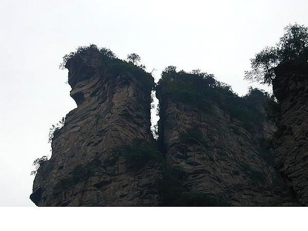 前方一座山峰,底部連成一體,頂部分成兩半,好像被什么東西劈開一樣,巧合的是,旁邊還有一座小山峰,很像一把巨大的斧頭,人稱此景為“劈山救母”,傳說是沉香救母時,以為這便是華山,劈到一半時,有人告訴他,這不是華山。從地質學的角度來看,主要是由于硬軟相間的巖層經過重力崩塌和流水切割作用形成的,是大自然的鬼斧所劈。